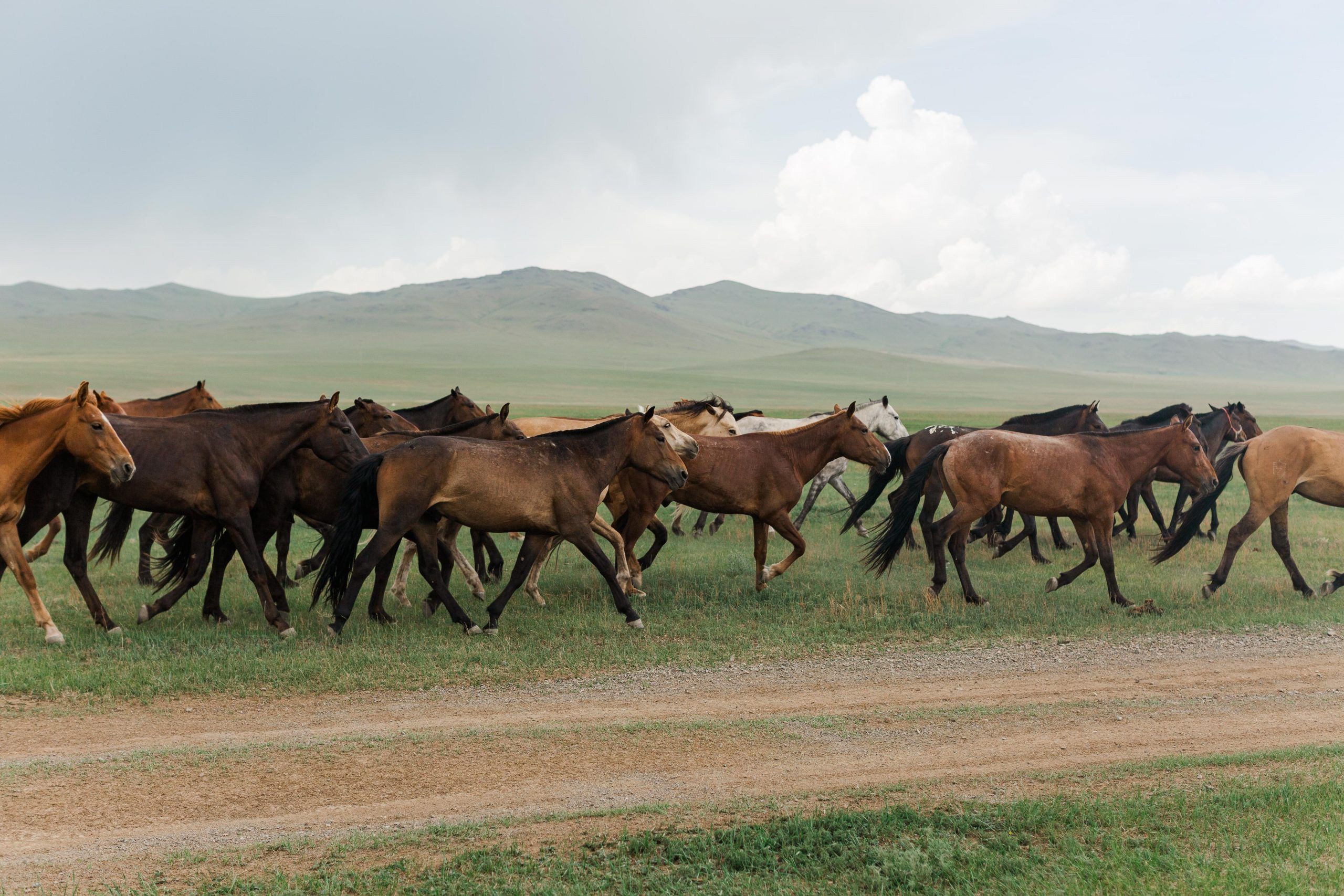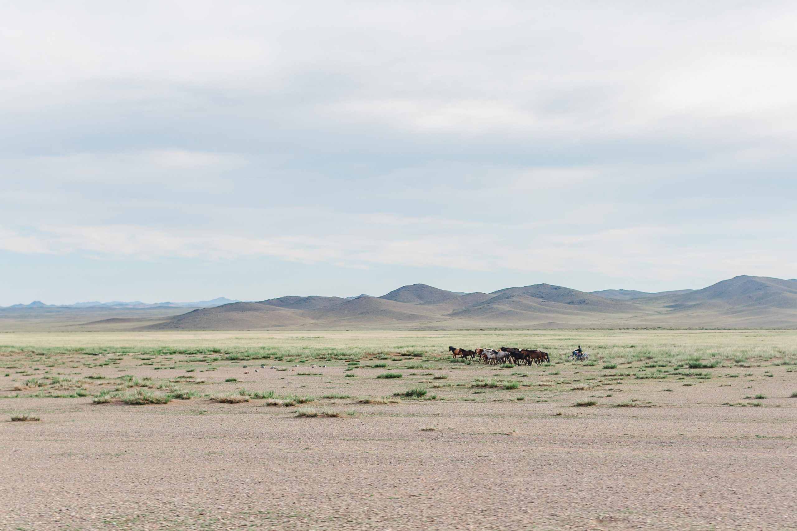 Thunder? I lift my eyes from the unusual tyre to the sky. Clouds yes, but no lightning. Then a mob of horses. This is the thunder. Small but majestic – the Mongolian horse.