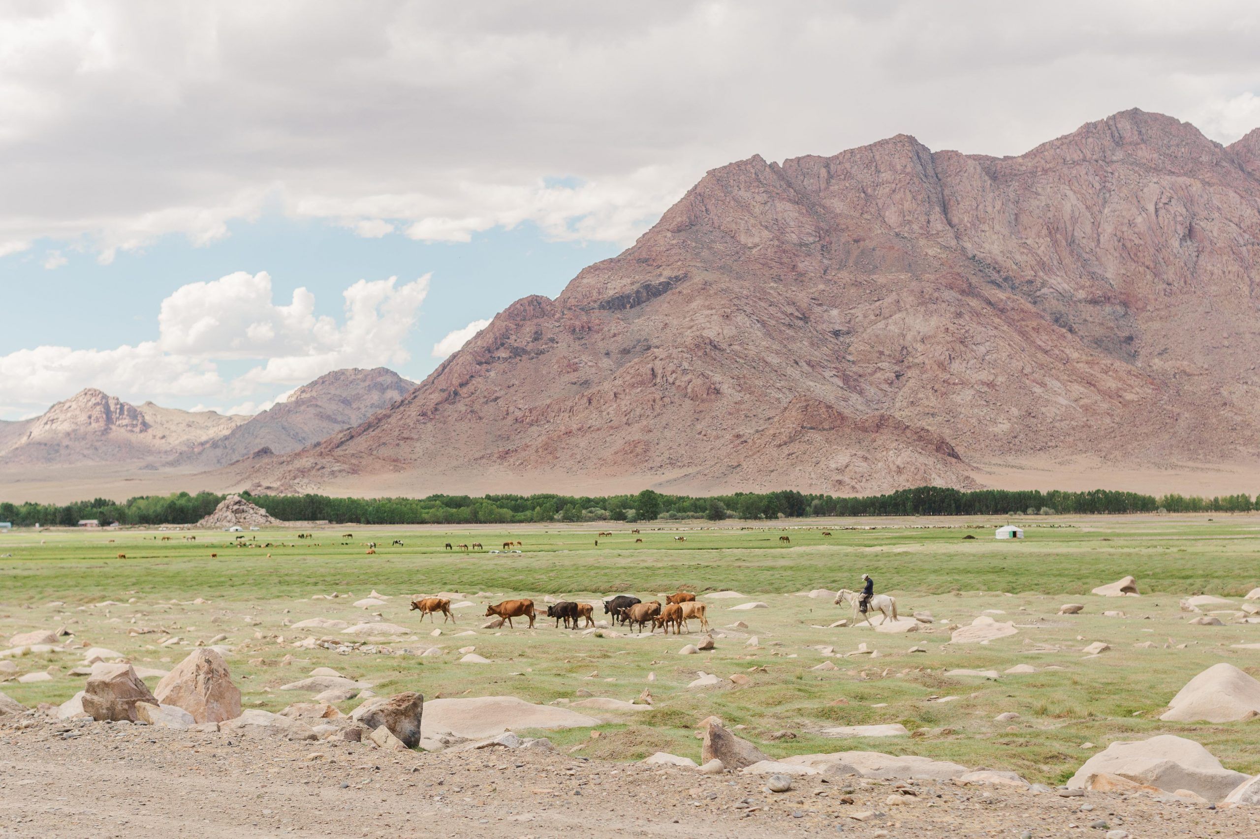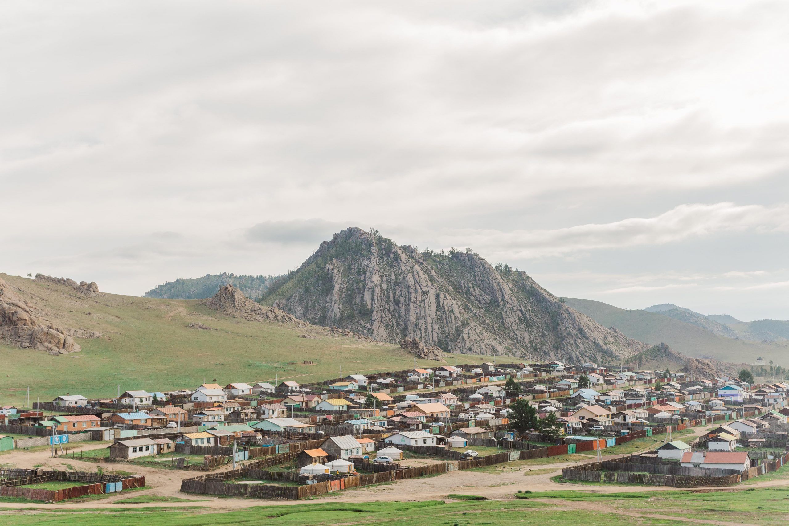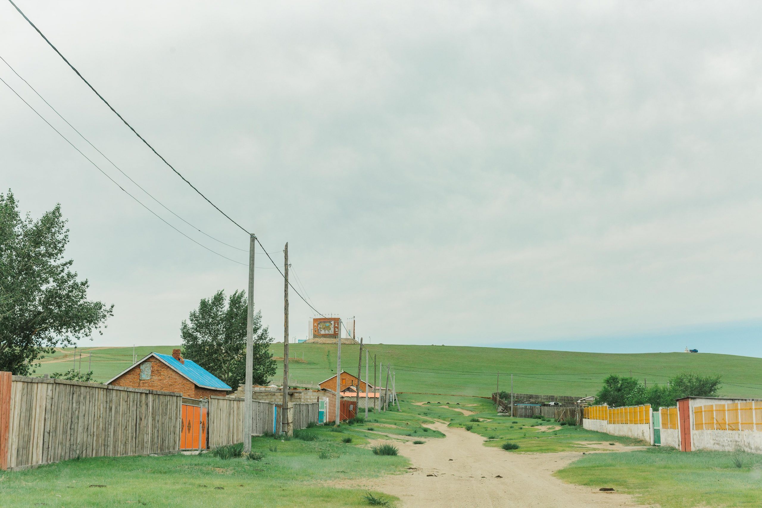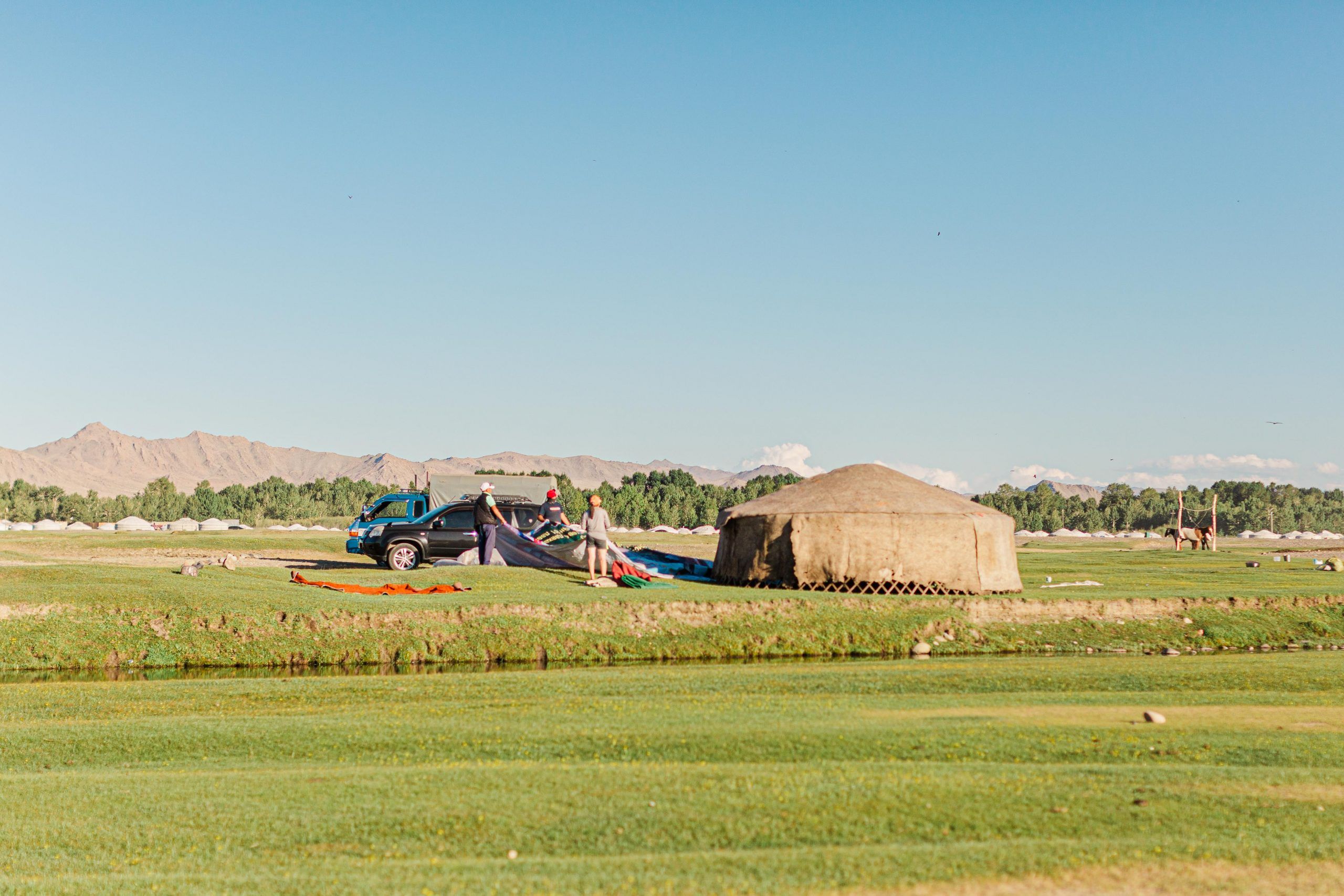 I eagerly take in the scenery now. The houses disappear. A small fenced area. A cluster of yurts. But where are the trees?