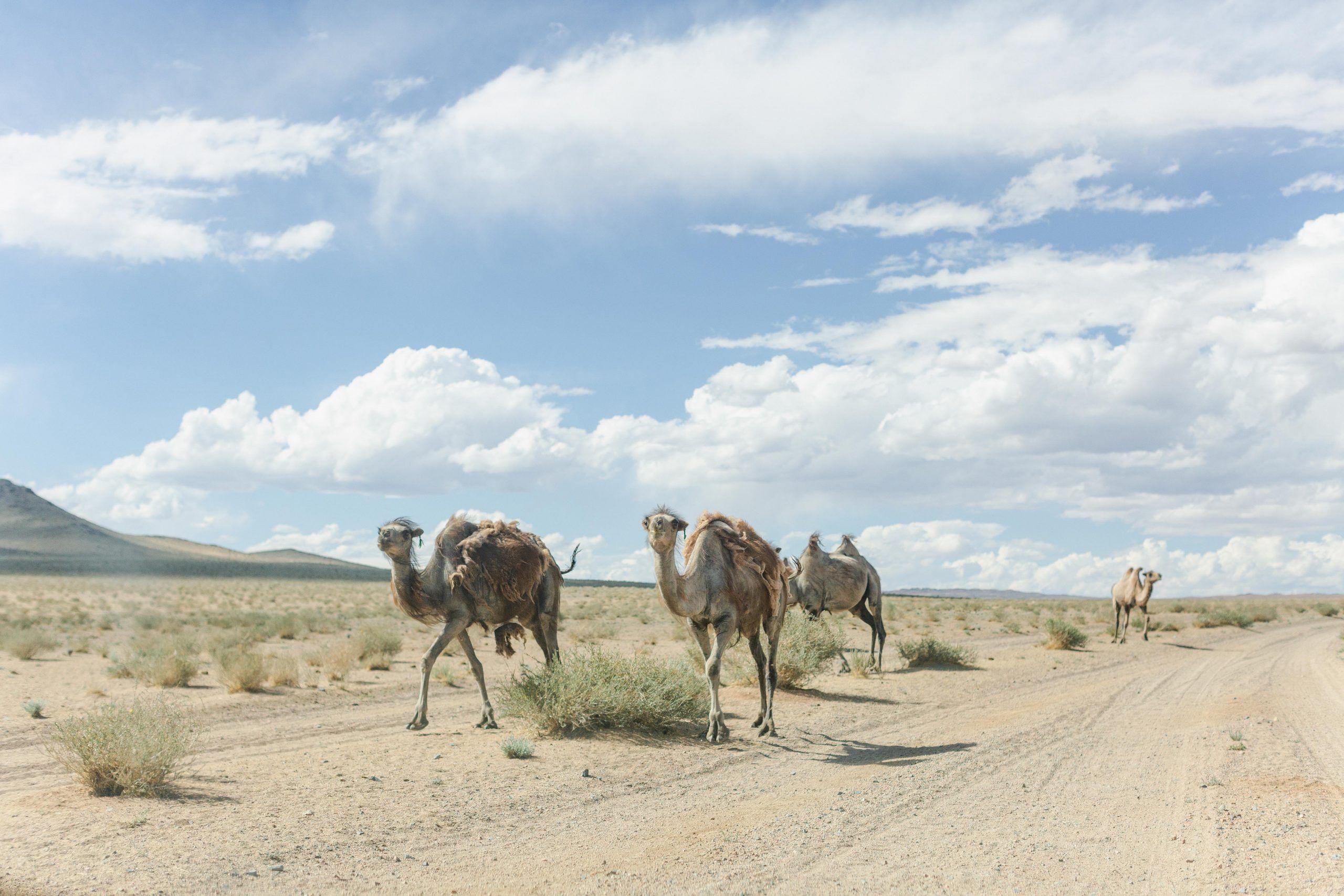 A herd of camels casually chew their cud as we pass, seemingly unbothered by us.